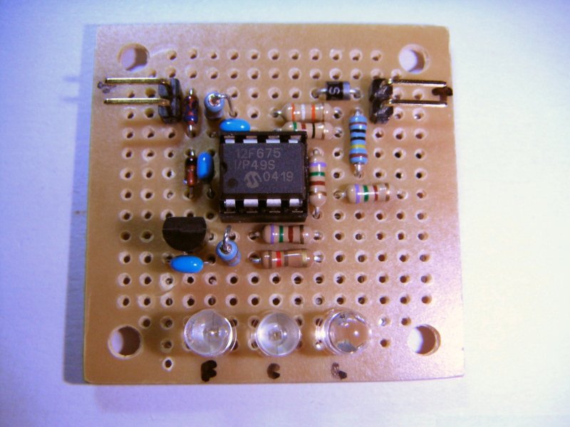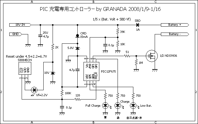 PIC は手持ちの潤沢な 12F675 を使用。まだポートが1つ余っているので、過放電防止機能を付けるといった改良も容易。