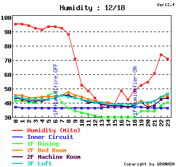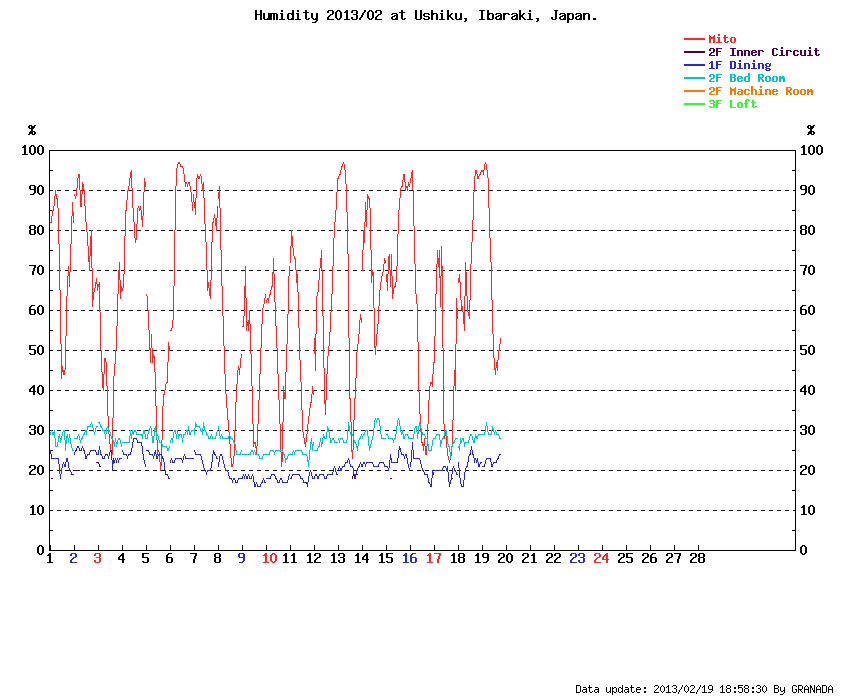 ソーラーサーキットに限らず、冬場の高気密・高断熱住宅は湿度低下が顕著と言われていますが、実際に湿度データを見ると、1階リビングは何もしないと30%程度で安定(?)しています。湿度が低いと結露しづらくなるので家のためには歓迎すべきなのですが、カミさん共々カゼにかかりやすくなったり、ノドの調子が悪くなったりするのでついに加湿器を投入。現在、11畳用の加湿器で無理やり家全体を加湿しているわけですが、データ的には1〜3階まで5%〜10%の加湿効果を確認。加湿器を投入してからはカミさんは(特に目覚めた時の)ノドの調子が良いと言っております。データ的には快適湿度55%にはほど遠いのですが、例え数%の違いでも人間の体は意外に敏感なようです