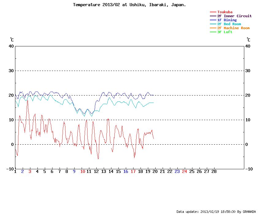 2階ベッドルーム、(4) 2階マシンルーム、(5) 3階小屋裏の5点。外気温と湿度は気象庁のホームページで1時間毎に更新されるデータを取るようにしました(気温:つくば、湿度:水戸)。