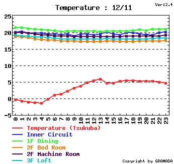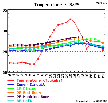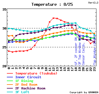 「夏涼しくて冬暖かい」。このソーラーサーキットの謳い文句はどの程度真実なのでしょうか? 原理的には従来の内断熱よりもはるかに優れているはずですが、陽当たりなどの立地条件や間取りなどの違いから実際どの程度の性能が発揮できるのかは物件毎に違ってくるはずです。そこで論より証拠、実際に我が家でソーラーサキットの性能がどのくらい出ているのか客観的なデータを取るべく1時間毎に室温・湿度を自動測定することにしました(測定方法の詳細についてはこちら)。測定した一日分のデータは毎日自動でこのページに送られ、グラフが更新されます。