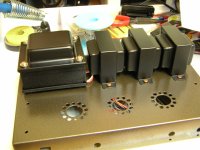 | 今回の主役、6BQ5 と 12AX7 | まずはトランス類を取り付けて・・・ 電源トランスがやたらと重い・・・ |