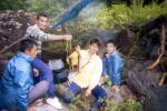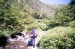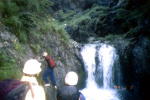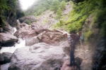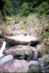 | 巨岩帯を行く。 | 堰堤の上流で幕営。イワナを釣り上げる。 | ||||