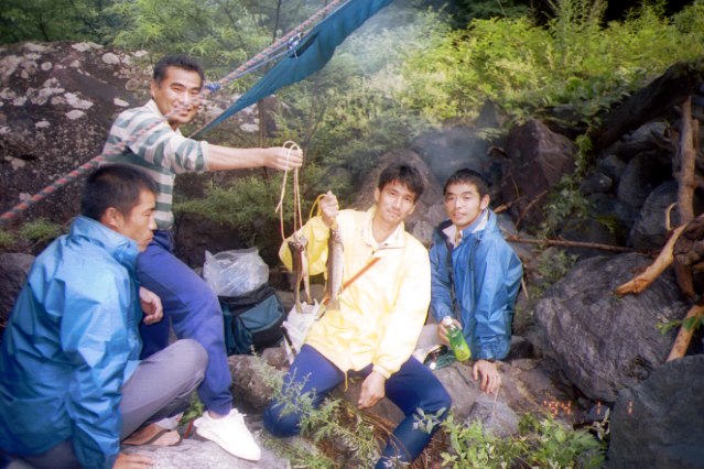 堰堤の上流で幕営。イワナを釣り上げる。