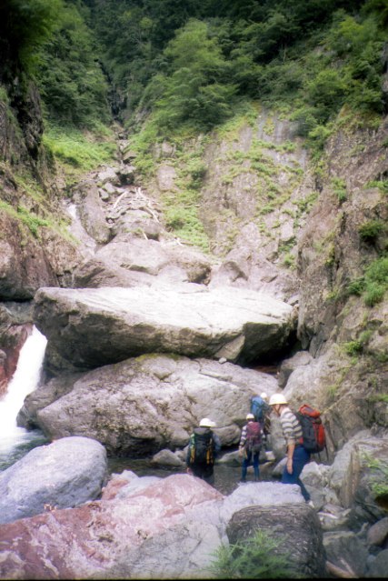 正面は下シシボネ沢。本流は右に折れて大ゴルジュ帯。高巻きをする。