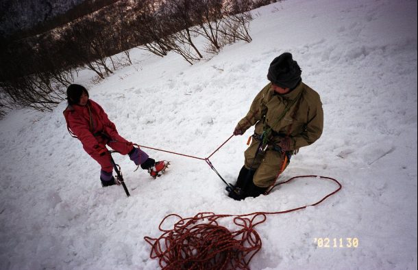 スタンディング・アックス・ビレイの悪い例(ワザと)。