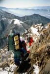 | ザイルの通っている所を登った。下が切れている。 | 天狗尾根上部から権現岳方面 | ||||