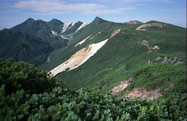 南岳付近から見た硫黄山と知円別岳