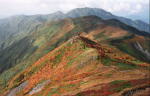 | 地神北峰から望む杁差(えぶりさし)岳方面。尾根上に頼母木小屋が見える。 | 地神山付近 | 門内小屋 | |||