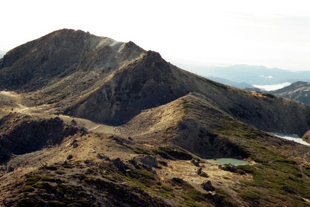 血の池と五色池(雪渓になっている)
