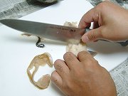足肉の中のキモを取り除くために、まず足肉を切り開きます。半分ほど切れば十分です。