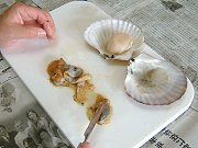 貝柱が貝殻に残らないように、ていねいにこそいでください。