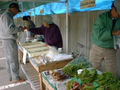 秋の宮山荘の駐車場では、毎週土日に朝市がある。訪れた当日は7,8人が店を出していた。地元の農家のあばさんたちが、とりたての山菜や、自家製の漬け物などを売ってくれる。干した大根や、餅菓子などもある。今回はおみやげに漬け物を2,3種買った。