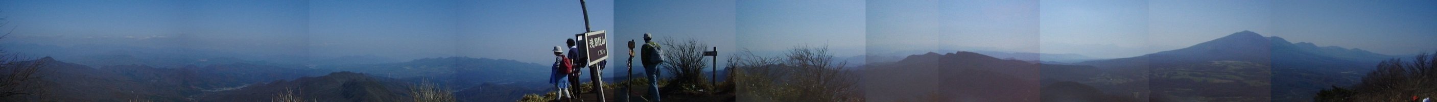 浅間隠山(あさまかくしやま)の山頂からの風景です。画像サイズが大きい(64kB)ので表示に時間がかかります。画面は北から時計回りに西までの270度の範囲です。当日は快晴で西の浅間山は美しいシルエットでした。