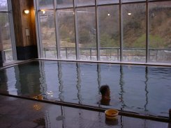 ![]() ■印象 観光シーズンではなく、訪れた時間も遅かったので、ほとんど客はいなかった。受付の若い女性は楽しそうに友達の客と談笑していた。遠くから来ると、ここがのんびりした土地柄という気がする。 3階に上がって、さっそく温泉に入る。広々とした浴室は先客が1人だけ。浴室の壁は天井から床までガラスになっているので、浴室がずいぶん明るく開放的だ。そこから外の銅山川が見下ろせる。このような展望風呂はたいへん面白い。 ![]() お湯は肘折温泉のお湯だ。薄い褐色である。景色を見下ろしながらのんびり浸かっているのは、大変気持ちがよい。泉質はナトリウム−塩化物炭酸水素温泉(旧泉名:含重曹−食塩泉)、源泉の温度は87.5度、PHは7.4である。 |