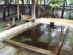 露天風呂は庭に面していて開放的なひのき風呂だ。昔の玄関を移築したという豪華な屋根がついている。お湯は麦茶色、こちらも気持ちよくかけ流されている。