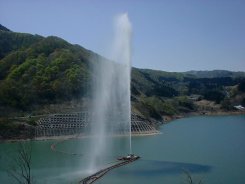 ■月山湖の噴水![]() 月山湖には東洋1という巨大な噴水設備がある。噴水は1時間に1回、15分ほど続けられる。噴水は徐々に高くなって10分で最高点になる。噴水の高さは112mだという。月山湖に道の駅があってそこが見物スポットだ。 平日は、10:00から1時間に1回16:00まで、土日は18:00まで行われる。 |