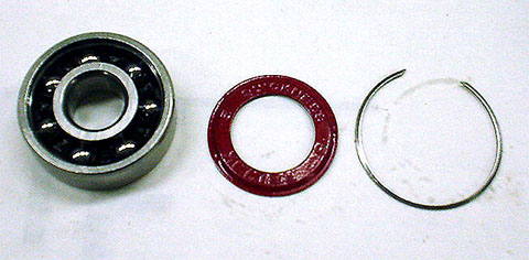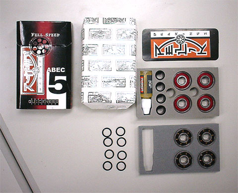 DEVIL」とは雲泥の差があります。しかし、更に驚くのはその中身で、上下2分割にキチンと各パーツの形に加工されたウレタンの緩衝材に収められたベアリングの他にスペーサーはもちろんの事、シム8枚と更になんとオイルまで付いてくると言う、揺り篭から墓場まで、一蓮托生?死なば諸共?とにかく至れり尽せりといった感じでしょうか? これで価格はABEC5の製品で3000円と言う、まるでテレビショッピング的お買い得感(笑)ABEC3の製品なら他の製品などブッチギリ!のコストパフォーマンスでしょう。 |
