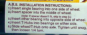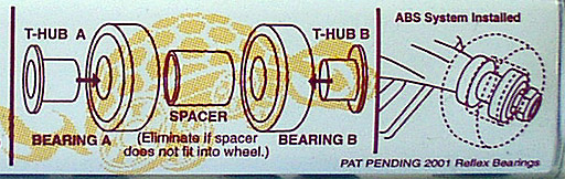 ・REFLEX A.B.S.ANTI-LOCK BEARING SYSTEM 初めてこの製品名を見た時、まず連想したのは車などに装備されるアンチロック・ブレーキ・システムの事であったが、これはアンチロック・ベアリング・システムの略であった・・・。 どの辺がアンチロックなのかと言うと通常、ウィールに挿入したベアリングはトラックに装着してアクセルナットを締めこんでいくと、ベアリングの内輪等が圧迫され回転が鈍くなってしまう。その防止の為、スペーサー(カラー)とシム等のワッシャーを入れて調整する事になるが、4輪全て調子よく同じバランスで整えるのは至難の業である。そこで、これらの作業を容易にする事を可能としたのがこの製品と言う訳ですな。 とは言え、ウィール等の精度など他の色んな要因が絡んでくるので完璧には不可能なのだが。 |