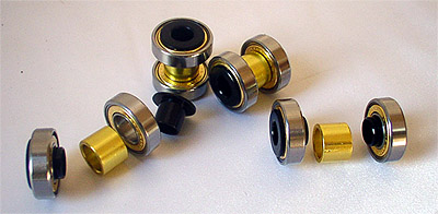 ベアリング自体はこのシステムの都合上、内径を大きくとる必要がある為にスケート用で一般的な608系のベアリングではない。内径が大きい分、中のボールは小径となり、ベアリング一つに対して使用されるボールの数は一般的な608系の7つに対して9つと多くなっている。ボールが小さく多いからと言って性能が良いという事ではないのでこの辺は気にする必要はない。 ・手回し感 普通に回る。ノイズも殆ど出ない。システム以外は普通のベアリングであった。 ・コメント 実はこのシステム自体は目新しい物ではない。 2輪のキックボードを発売していたmicroから2000年には既に同様の構成のシステムが発売されていた。 ベアリングが一般的なものではないため、ベアリング交換等の汎用性が低いのが欠点。また、システムの構成上、一度ウィールに挿入してしまうと取り外しが極めて困難と言うのも付け加えておく。 |