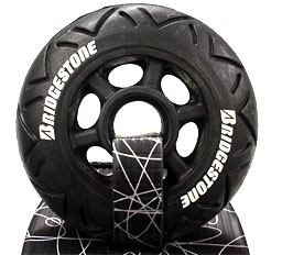 BRIGESTONEのロゴが良い感じです。 コア部分は非常に丈夫そうです。感触は金属?と思うくらいしっかりしたものです。しかも軽い!! 径は90mm 硬さは82Aと、硬さはノーマルウィールとスペック上はそんなに違わないですが触ってみると弾力が感じられます。ゴムだから? |
