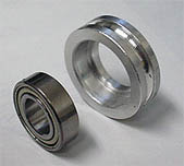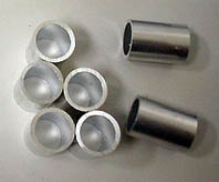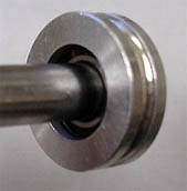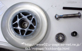 その構造上、ベアリングとベアリングの間にはさむスペーサー(カラー)が通常のスケートボードやキックボードのものが使えないのでショック!。通常の物は約10mmですがMINI-MISER に使用するには約4mm ほど足りません。それを埋める分厚いシムなど有るはずも無く、ワッシャ-では構造的にMINI-MISER の軸に届きません。これだけ特殊な構成でありながらスペーサーが付属してこないのは疑問を感じます。以上の事からMINI-MISER を使うには約14mmと言う特殊なサイズのスペーサーを用意する必要があります。これを用意するのが唯一の難関で、用意さえ出来れば後は普通のベアリングと変わり有りません。内径8mmのアルミパイプを自分で切断する事も可能ですが、まともな工具がないと水平に正確に切る事は難しいのでお勧めできませんが、以下の方法でお住まいの地域の条件がかなり限定されますが女の子にも気楽にオリジナルサイズのスペーサーが入手可能です。 |