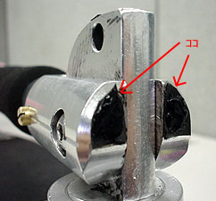 ココにもゴム板を接着。この部分はスティックを立てたときの隙間が非常に狭く0.5mm厚では厚すぎて接触面全面に張ることは出来ませんでした。0,1mm〜0,2mm程度の厚さのゴムを調達しないと無理ですね。今後の課題です。 |