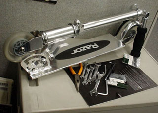 | 街でよく見かけるRAZOR、小回りが効くのでチョイ乗りには便利。このRAZORのパーツはキックボードと無改造で共有出来る物が以外と多いのです。 |