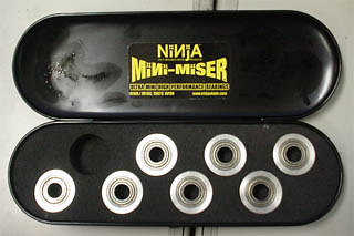 SPICY ワイドウィール、ブリヂストンウィール 、とウィールが増えてきたのでそれぞれ違ったベアリングを付けてみようと思っていたところ、シールドなどの色違い程度しか変化の無い市販ベアリングの中において唯一、独特の構造を持つNINJA MINI-MISERが転がり込んできましたのでレポートします。 |