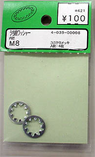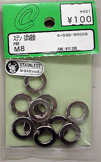 用意したのは、「うち歯ワッシャ-」とステンレス製の「バネ座金」(スプリングワッシャ-)の二種類、どちらも内径は8mmの物です。この二つのうちどちらが良いかを試してみます。 |