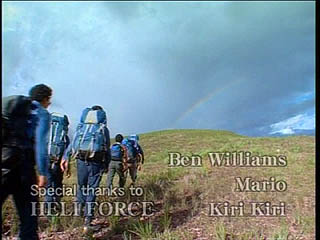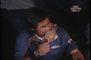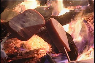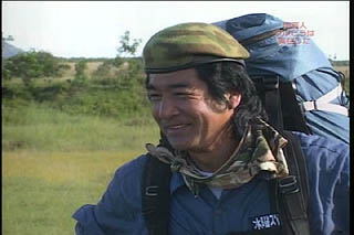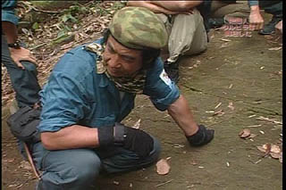ボートが来るまでここでキャンプすることになり厚切りの太いハムを火で焙り・・・ 藤岡隊長 「ワンパクでもいい、 大切なのは慌てないことだ〜・・・ (隊員達には)たくましく育って欲しい〜・・・」 |