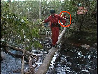 あせってしまったのか?白鳥隊員がなぜか前の隊員が渡りきる前にジャンプして丸太に乗っかってしまった。 |
