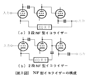 イコライザー方式には大きく分けて、NF型、CR型、NF−CR折衷型があります。以前は管球式、TR式を問わずNF型が多かったのですが、最近のアンプではCR型が主流です。TR式の場合には素子の性能向上により、十分なSN比が得られていますが、管球式の場合、CR型にはSN比か許容入力のどちらかを犠牲にしなければならないという欠点があります。図1にCR型の構成例を示しますが、前段で利得をかせぐとSN比では有利だが高域の許容入力の点で不利となります。逆に後段で利得をかせぐと、許容入力では有利だがSN比の点で不利となります。通常は共に30倍程度に設定し、EQ素子での1/10の減衰と合わせて全体の利得を100倍程度とすることが多いようです。