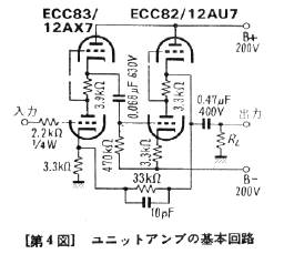 本機では、10倍程度の利得をもつユニットアンプを考え、イコライザー段に2個、トーンコントロール段に1個使用することにしました。このようにアンプを標準化することによって、充分に回路を煮つめることができます。ユニットアンプを設計するにあたっては、表2に示すような性能仕様を目標とします。基本的には裸特性を良くして、NFBはあまりかけずに安定度を重視する考えをとります。NFBなしで20kHzまでフラットとか歪率を低くすることは、従来の管球式NFアンプでは割合軽んじられていた要素と言えるでしょう。2段アンプを構成するのに、良く使われる12AX7−12AX7という構成では、利得が高過ぎ帯域も狭くなってしまいます。最大出力を大きく取るために2段目にSRPPを採用し、12AX7−12AU7の組み合わせで行くことにしました。SRPPについては、以前本誌に動作の解析が紹介されたことがありますが、結論を簡単にいうと、低μ管でカソード抵抗を大きめに選び、カソードのパスコンを外すと、プッシュプルのバランスが取れて極めて低歪みとすることが可能となります。また、インピーダンスを下げて高域特性を良くするため、1段目もSRPPとしました。図4にユニットアンプの基本回路を示しますが、この定数ではSRPPのバランスがかなり良く取れて低歪みとなります(図5参照)。ただこのバランスは出力負荷抵抗によって変わるので、あまり完全にバランスをとるのは無理です。もしバランスを完全にとるならば、バッファーアンプが必要でしょう。また2段目のカソードのパスコンを外したため、電流帰還がかかって利得が少なくなり、ミラー効果による高域の減衰がおきにくいという利点があります。実験機ではNFBなしでのカットオフ周波数が40kHz以上でしたが、実際に基板を起こしたところ、浮遊容量が増えて20kHzそこそこに留まったのは残念です。