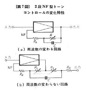 2段帰還型のもう一つの欠点は、周波数を切り換えるのが難しいことにあります。簡単な回路で切り換えるためには、特性を決めるコンデンサーを1個とすれば良いのですが、例えば低域上昇の場合、図7(1)に示すように単にコンデンサーの並列抵抗を変化させたのでは、変化量の少ない時と多い時とでターンオーバー周波数が変化してしまう結果となります。これを防ぐには(2)のようにパラメータをもう一つ増やして、周波数が変化しないようにすれば良いのです。もっともこうすると、出力が抵抗で分割されるため、最大出力電圧が低くなるという欠点があります。回路図でみて分かるように、高域でもパラメータを増やし、NFB回路と次段の抵抗値の等しい対称形としました。こうすると、上昇・下降の抵抗が共用できるようになります。また、フラット位置では完全にコンデンサーが回路から外れるようにしてあります。周波数特性の計算式はかなり複雑なので省略しますが、さらに直流をスイッチに流さないようにしたため、コンデンサーが入って回路が複雑になるとともに超低域の特性が不自然になってしまいました。スイッチの切り替え雑音を防ぐための処置なのですが、このあたりは少し凝りすぎたかも知れません。