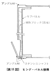 ケースは自作アンプの場合最も頭の痛いところですが、わざわざ作る以上一番凝りたいところでもあります。特注すると高価になるので市販のケースを改造し、パネルは自作することにしました。使用したケースはリードのYT−370です。14球のアンプにしては小さいケースですが、私は小さいアンプが好きなのでなんとか詰め込むことにしました。しかし、調整や修理の時に分解するのが大変なので、その点を考えればふた回りぐらい大きいケースにゆったり作った方がよいでしょう。パネルは高級感を出すために、タカチ電機のアングル材を加工して使いました。パネル下側をヒンジ・パネルとして開閉ができるようにしました。このためパネルデザインがすっきりしました。アマチュアでここまでやる人はあまりいないかも知れませんので、この部分の機構を図11に詳しく示します。ヒンジ・パネルを保持するため、家具の扉などに使うマグネットをプッシュスイッチに接着して取り付けました。パネルはヘアライン仕上げの後アルマイト加工をしています。自分でやったので少しむらができてしまいました。パネルの文字入れにはインスタントレタリングを用いましたが、好きな字体が選べるので良いと思います。上からスプレーしておけば強度の点でもあまり問題はありません。ツマミはたまたま秋葉原で見つけたものです。デザインのバランスを考えて、ツマミはパネルから少し沈めて取り付けてあります。