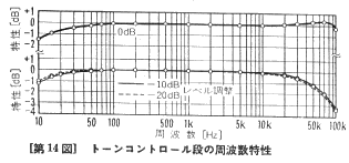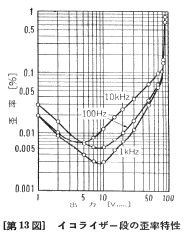 イコライザーのRIAA偏差特性を図12に示します。超低域では減衰させ、可聴帯域内では±0.5dB以内に入れています。イコライザー部の歪率特性を図13に示します。グラフから分かるように、イコライザー部は最大出力電圧が大きいため許容入力には十分余裕があります。最大出力を80Vとして約800mV(1kHz)の許容入力です。特にNF−CR型の特徴として、低域から高域まで歪率特性のカーブに殆ど違いのない点は注目に値すると思います。高域で歪み率のカーブに段がついているのは、前段と後段のユニットアンプ双方の歪が干渉しているためで、さらに周波数が高くなると前段が先に歪むようになります。残留雑音の主成分は低域のフリッカーで、イコライザーアンプの入力換算雑音はJIS−A補正で−118dBV程度と十分小さい値です。