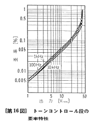 トーンコントロール部の周波数特性を図14に示します。レベル調整を切り替えると、インピーダンスが上昇して、図に示すように高域特性が悪化しますが、それでもカットオフ周波数(−3dB)は90kHz程度で、管球式としてはかなりの広帯域でしょう。トーンコントロールの変化特性を図15に示します。変化量は設計値の±6dBよりも少し少なくなりました。超低域が持ち上がるのは、NFB回路に直流をカットするコンデンサーが入っているためで、トーンコントロールを入れることにより、インピーダンスが上がるために、やはり高域特性の悪化がみられます。図16に示す歪率特性は大変素直なカーブで、歪の主成分はきれいな2次高調波です。入力換算雑音は無補正で−103dBV程度と小さくなっています。