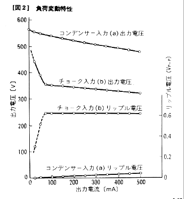 グラフからわかるように、チョーク入力の長所としては、出力電流が75mA以上の範囲において、直流でのインピーダンスが72Ωと低く一定であることです。これは、RsとRchの和(70Ω)にほぼ等しい値です。わずかな差は、ダイオードのON抵抗でしょう。コンデンサ入力の場合は、負荷によって直流インピーダンスが120〜180Ω程度で変動します。確かに変動率という点では、性能に大きな差があるようです。またチョーク入力では、ダイオードに安定して電流が流れるため、パルス性雑音が激減します。短所としては、コンデンサ入力に比べ、リップル電圧が大きいことで、図1の定数ではチョーク入力の場合、0.6Vp-p程度のリップルがあります。これでも出力段用としては何とか使える値ですし、大きさは電流によらず一定です。これに対し、コンデンサ入力では出力電流に比例してリップル電圧が増加しますが、500mA流しても0.04Vp-p以下と1桁以上低い値です。従って、チョークコイルをもう少しインダクタンスの小さなもの(例えば1.5H,20Ω)に変更しても十分な性能です。それによって、直流インピーダンスも少し改善できます。また、同じ交流入力電圧ではチョーク入力は出力電圧がコンデンサ入力の65%程度に低くなってしまいます。