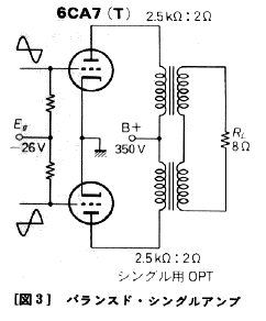 以前、真空管の動特性曲線から3次歪みの打ち消し条件を考察したときには*2、3極管でも5極管でも、もともとの3次歪みは波形の山をつぶす方向だと思っていたのですが、以上の考察から3極管のプッシュプルでは必ず波形の山をとがらせる方向の3次歪みを、かなりの量発生することがわかりました。こうなると、プッシュプルが波形合成により歪みを低減していると自信を持って言い切ることはできなくなります。これは全くの思いつきですが、歪み率のことだけを考えるならば、プッシュプルにするよりも、図3のように2台のシングルアンプを出力トランスの2次側で合成した「バランスド・シングルアンプ」の方が、低歪みとなる可能性があるように思われます。2台のシングルアンプに逆相の入力を加えて出力で合成すれば、2次歪みは打ち消されて0となり、3次歪み率はシングルの場合と同じになるからです。3次歪みの打ち消しについてはいろいろ検討中です。