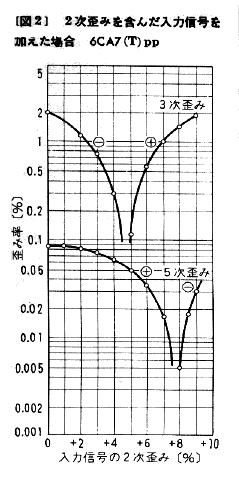 これは明らかに前段と出力段との間で,3次歪みの打ち消しが行われているとにらみました.武末アンプは図1のような構成で,ドライブ段が差動増幅ではありません.従って,ドライブ段で発生した2次歪みはそのまま出力段に加えられます.プッシュプル出力段では,波形の合成によって2次歪みが打ち消され,逆に3次歪みは増加するわけですが,入力信号に2次歪みが多く含まれていると,やはり3次歪みが増えます.ところが,3極管プッシュプルではもともと波形をとがらせる位相の3次歪みを生じるのに対し,入力に2次歪みを含む信号が加えられると,波形をつぶす位相の3次歪みを発生します.この両者が逆位相であるため,3次歪みの打ち消しが行われることがわかりました.図2は6CA7(3結)プッシュプルで,RL=5kΩ,Ebb=400V,Ip0=60mAの場合のパソコンによる計算例です.出力段のみでは,最大出力時に2%程度の3次歪みがありますが,入力に5%前後の2次歪みを加えたところで3次歪みが完全に打ち消され,それ以上になるとまた増加するという計算結果になりました.