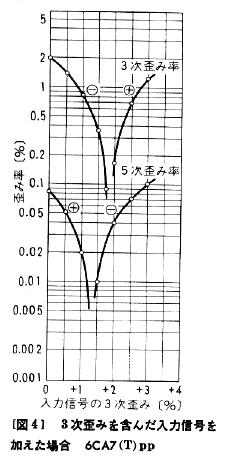 黒川氏のアンプ(図3)では,高域特性を改善するという目的で,前段の負荷抵抗を極端に低く選んでおり,この6RA8PPの場合も,5.1〜5.2kΩと異常に低いため,一見して直線性は悪いことがわかります.実はそのために,前段で大きな3次歪みを生じているのです.これに対し,普通の2段差動増幅では,歪みが少なすぎて出力段との間で歪み打ち消しが期待できません.差動増幅(ムラード型を含む)の場合,発生する3次歪みは,波形をつぶす位相にもできるので,出力段との間で歪みの打ち消しが可能になります.総合歪み率はほぼ両者の差で表せますが,図2と同じ条件での計算結果を図4に示します.