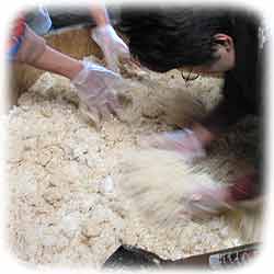 | 仕上げはやっぱりプロの手で。さすがに年期が入っています。 ポリ容器に分けて、これを一年間寝かせるとおいしい味噌になる。 |