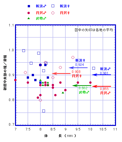 肩幅に対する鞘翅中央部の幅を測長しグラフにしたものを図1に示す。