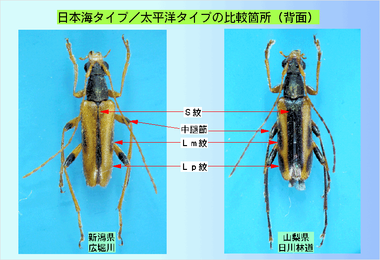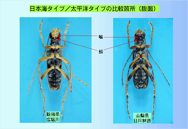 - 図には典型的太平洋タイプとして山梨県日川林道の個体と日本海タイプとして新潟県広堀川の個体によって比較箇所を示した。
