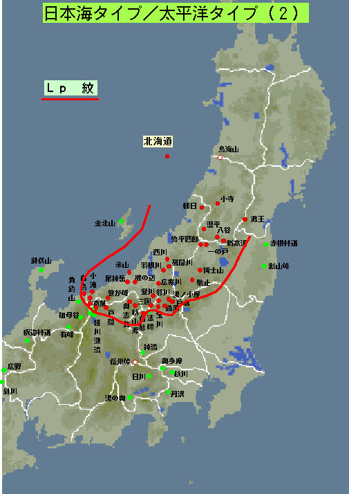 - また,図4にはLp紋での日本海側タイプ/太平洋側タイプの分布を示した。