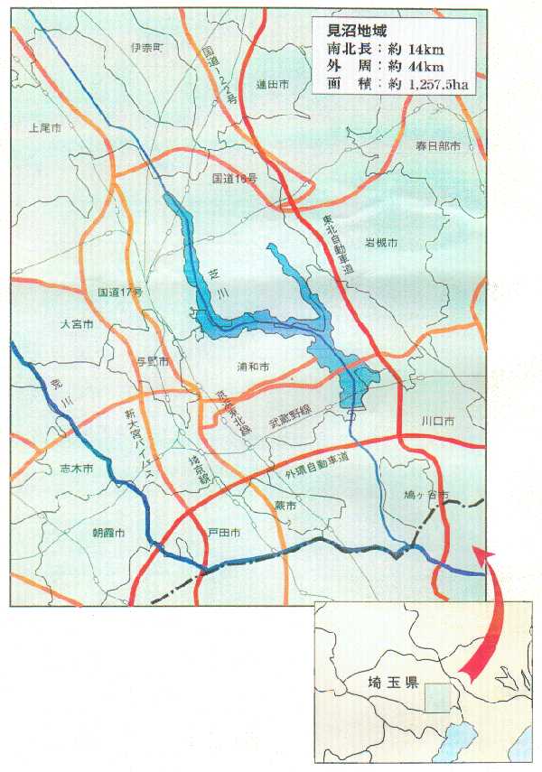 芝川の上流域である大宮台地内に形成された低平地に位置する見沼地域は、見沼たんぼとも呼ぱれ、川口、浦和、大宮の三市にまたがり、東京から20〜30km圏に位置しています。南北は約14km、外周は44km、面積約1,257.5haの首都近郊に残された数少ない大規模緑地空間です。 見沼地域は、縄文時代の頃は東京湾の入り江の一つでした。今から約6,000年前に荒川下流域の陸化に伴い、沼や湿地となり、その中央を芝川が流れていました。江戸時代になると、水田のためのかんがい用水の必要性から、現在の浦和市大間木附島と川口市木曾呂の間で芝川を堰止めた溜池がつくられ、堰は長さが8町あったことからハ丁堰と呼ばれていました。その後享保の改革で溜池の干拓が行われ、溜池に代わる2つの用水が利根川から引かれることとなり(現在の見沼代用水西縁と東縁)、見沼たんぼは水田地帯として生まれ変わりました。 近年、周辺の都市化の進展や営農環境の変化などにより見沼地域に対する開発圧力が増大している一方で、首都近郊に残された大規模緑地空間として新たな視点からの土地利用を求める声が高まってきてます。こうした状況の中、埼玉県では「見沼三原則」に代わる新たな土地利用の基準として「見沼田圃の保全・創造・活用の墓本方針」を定めました。 |
