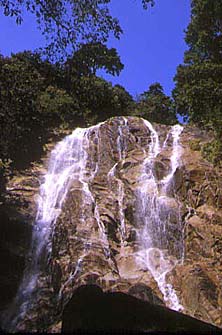 深い杉林の中、巨石が並ぶ清流に落ちる高さは50mの名漠。