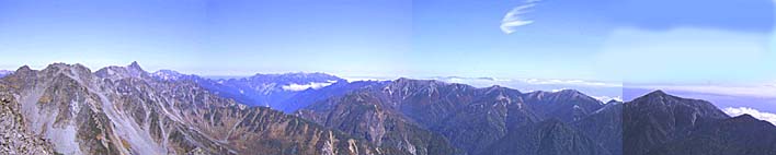 左から槍ヶ岳、東鎌尾根、鹿島槍、そして常念岳に蝶ヶ岳の峰々が続く