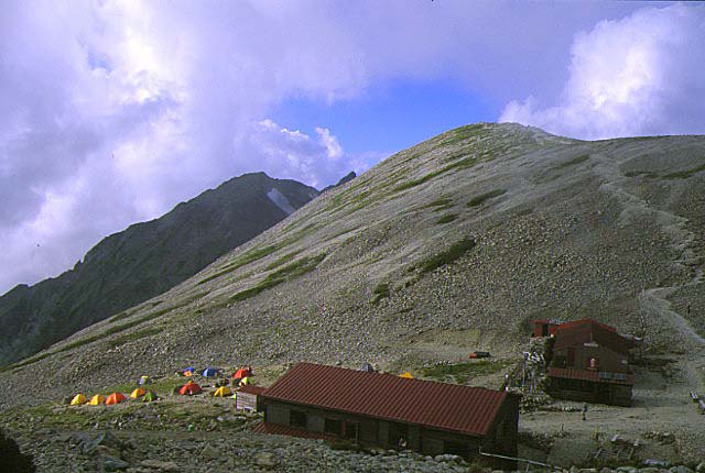 真下に南岳小屋。この尾根を登れば南岳(3032m)のピークがある。その後ろに中岳(3084m)、更に後方チラッと頭を出す槍ヶ岳の尖がったピーク。これらを縦走してきました。