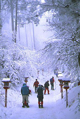 参道の斜面が凍結、雪が覆い、アイゼン無しでは歩けない。荒縄を靴に巻き付け歩いている方もあった。